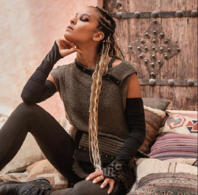 Long gloves or arm warmers, with a strap for the middle finger. Horizontal panels are making up most of the arms, while the hand part is decorated with a screen-print design inspired by the art of the 'Bogolafini' mud cloth from Mali.