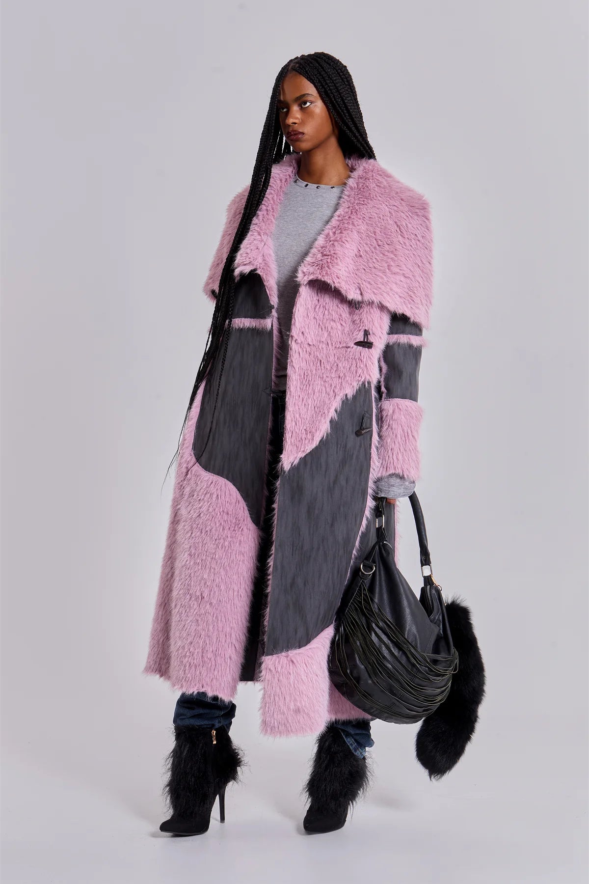 ALISE PATCHWORK Faux Suede & Fur Maxi Coat