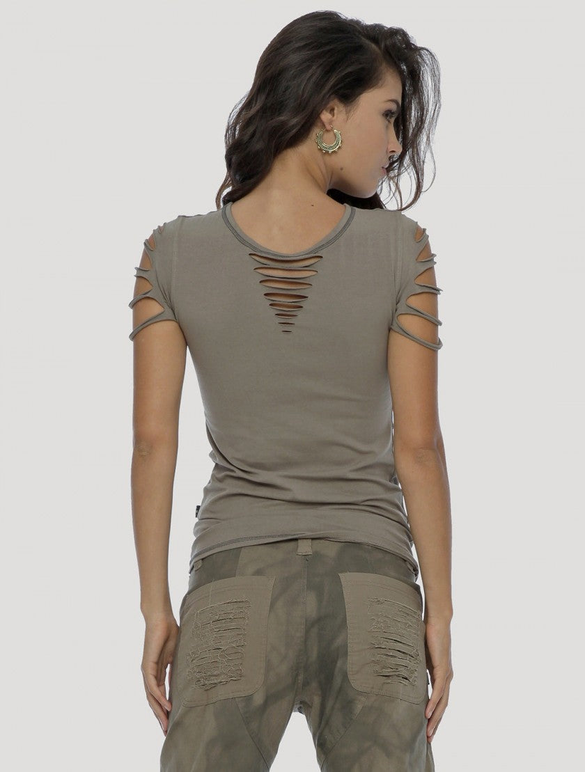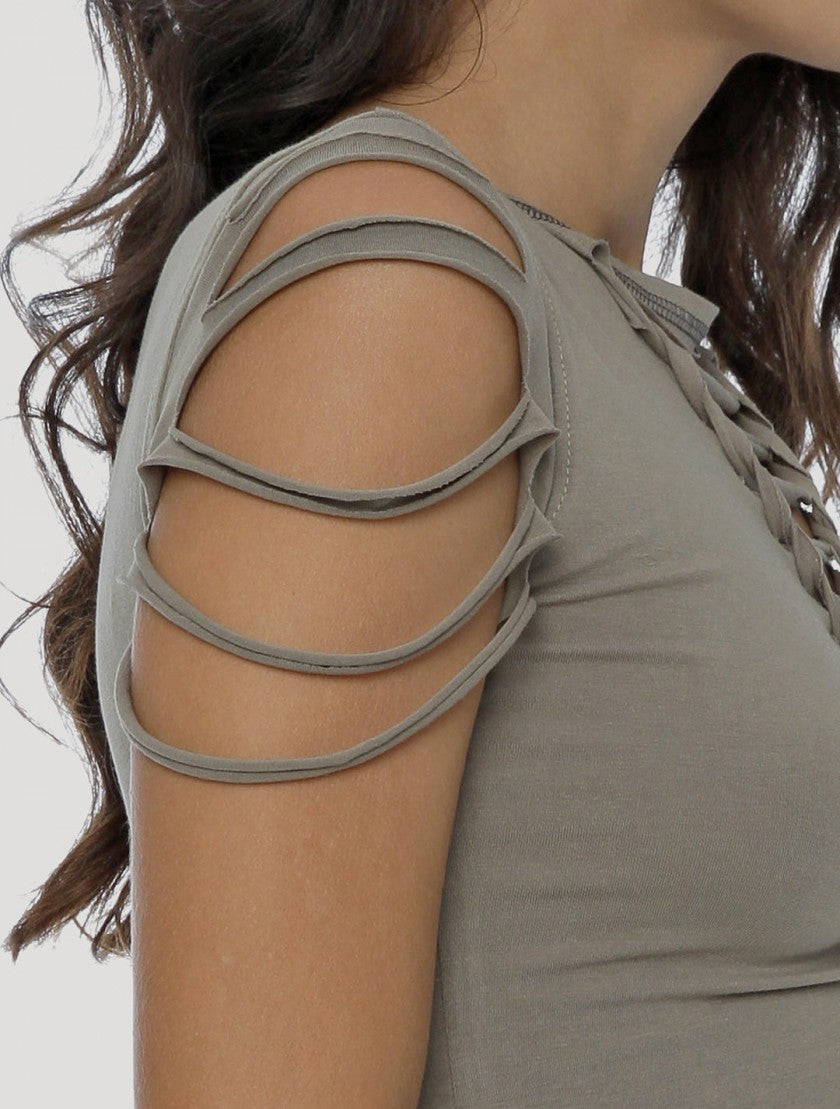Going for a funky, post-apocalyptic look? This fitted top, with its slashes and braiding, is the one for you!