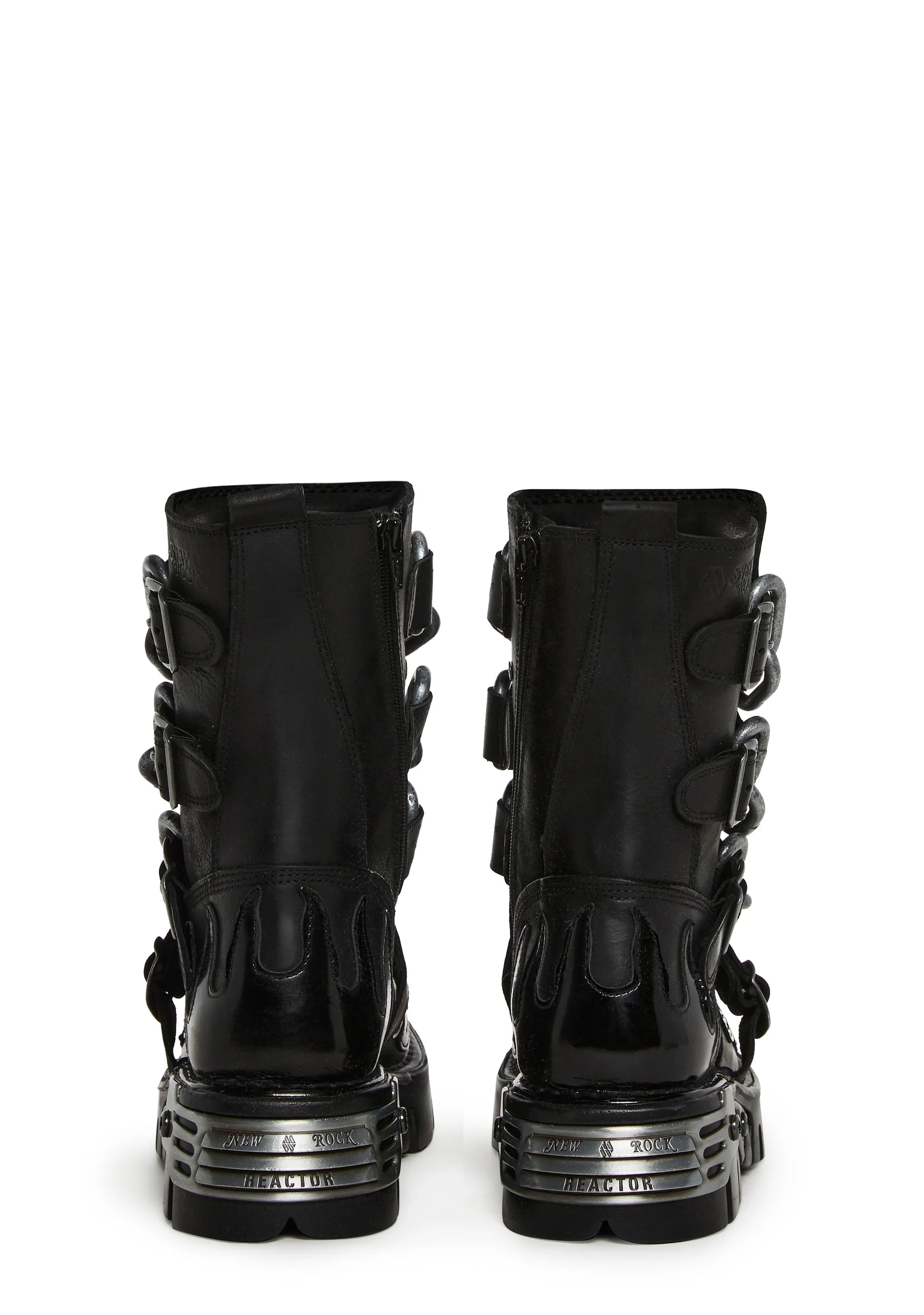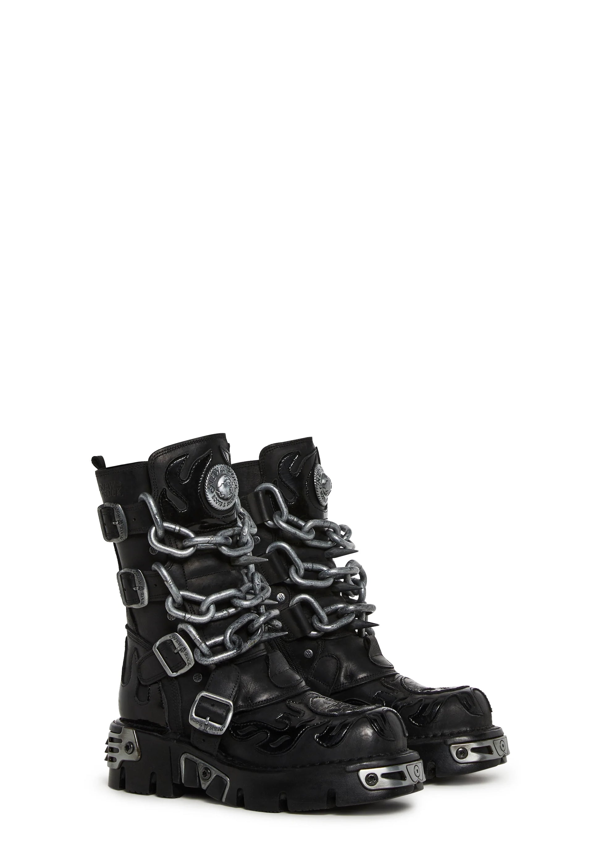 Bold platform boots crafted in genuine leather, featuring spiked chain details, adjustable buckles, metal hardware, vinyl flame & skull appliqués, and an easy side-zip closure.