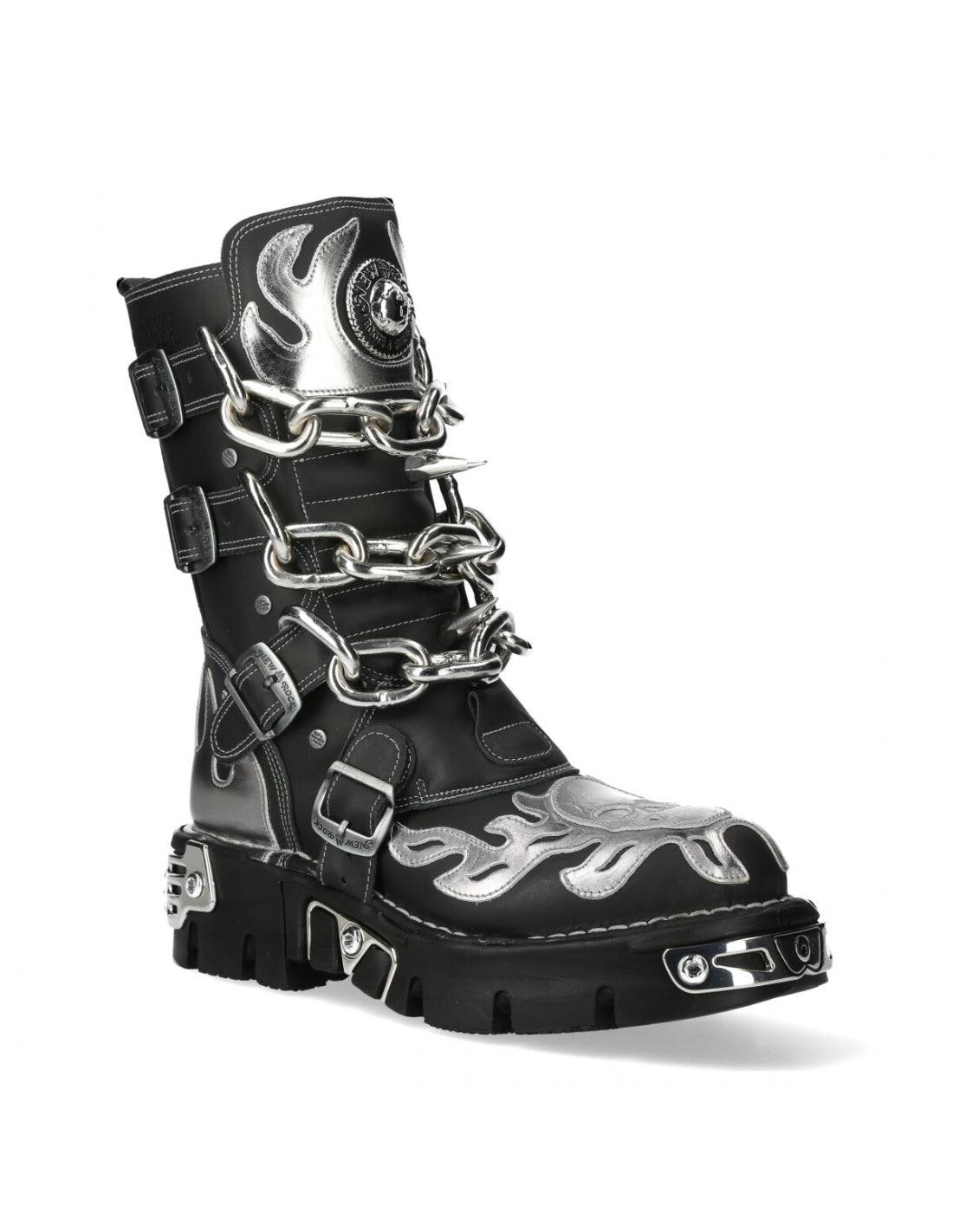 A striking mid-calf boot engineered from genuine leather, merging New Rock’s industrial heritage with a rugged gothic presence.