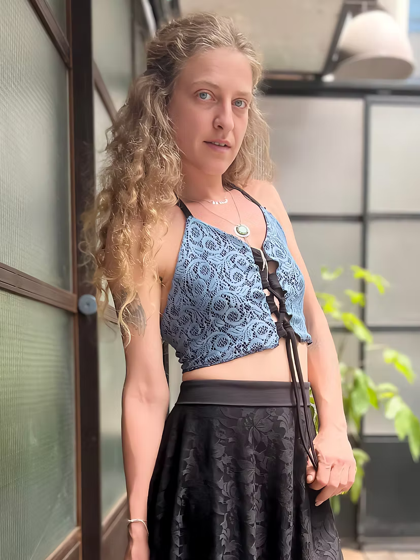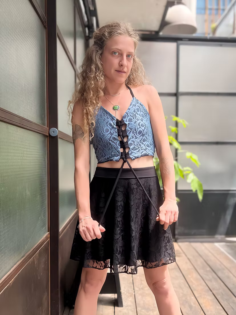 The COSMOS features a flattering halter cut with adjustable front ties and a reversible design — mystical black lace on one side, smooth clean fabric on the other.