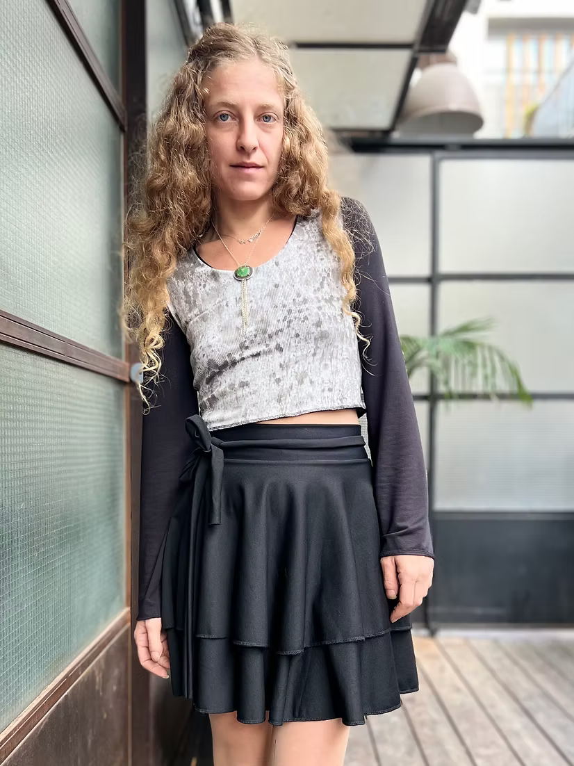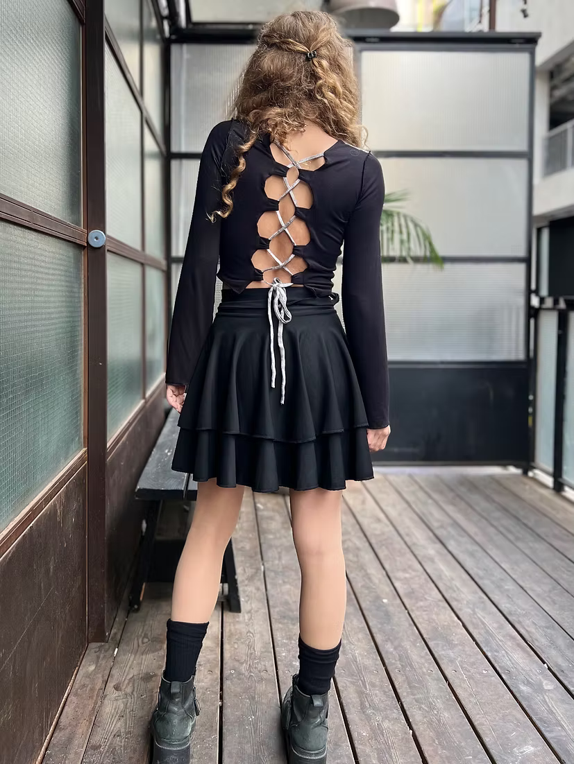 A soft long-sleeve cropped top with an open back and a touch of wild tie-dye magic.