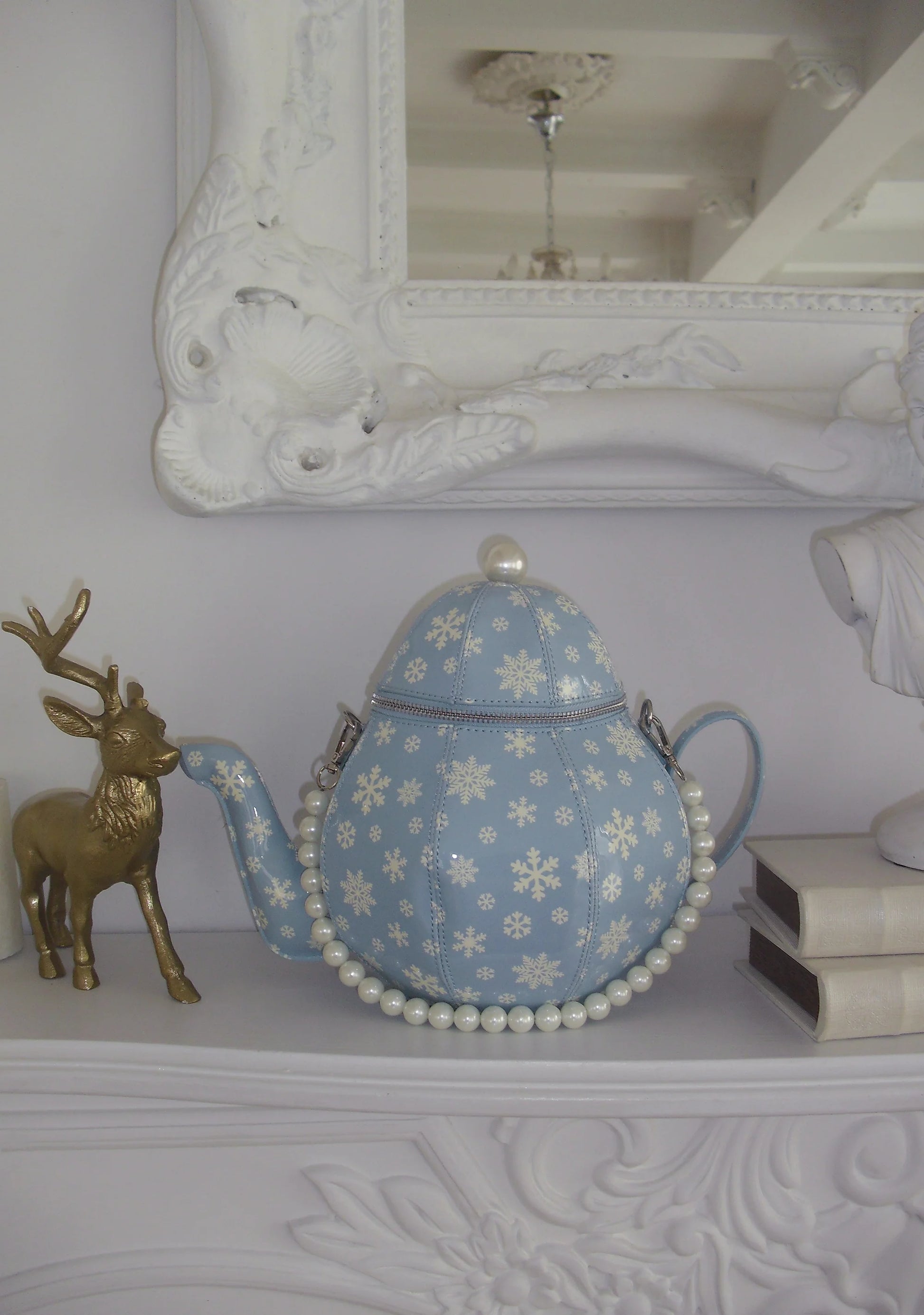 Features a top zip closure and comes with a mini teacup charm — creepy-cute, dramatic, and impossible to ignore.
