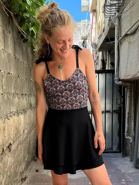 Below, a two-layer flowing skirt made from black symphony-style fabric moves like shadow and moonlight — soft, free, and quietly powerful.