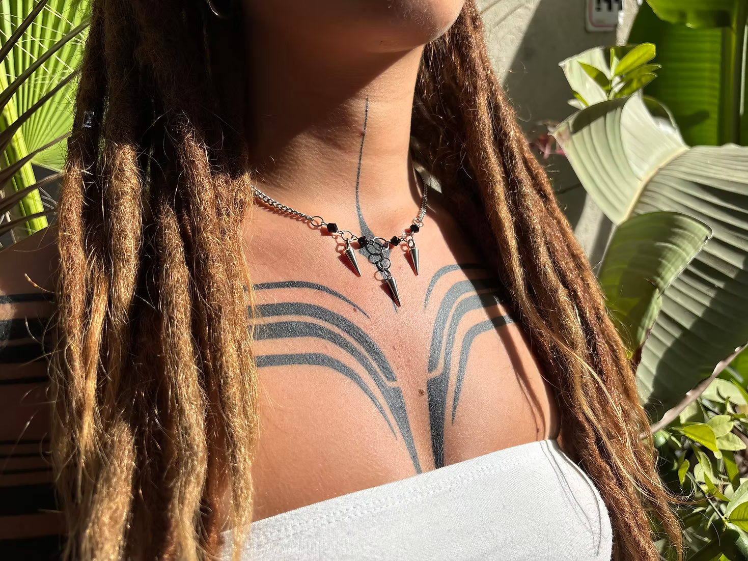 a striking combination of sparkling dark beads, silver spikes, and a stainless-steel chain, all meticulously handcrafted to bring forward a tribal, dark, and elegant statement.
