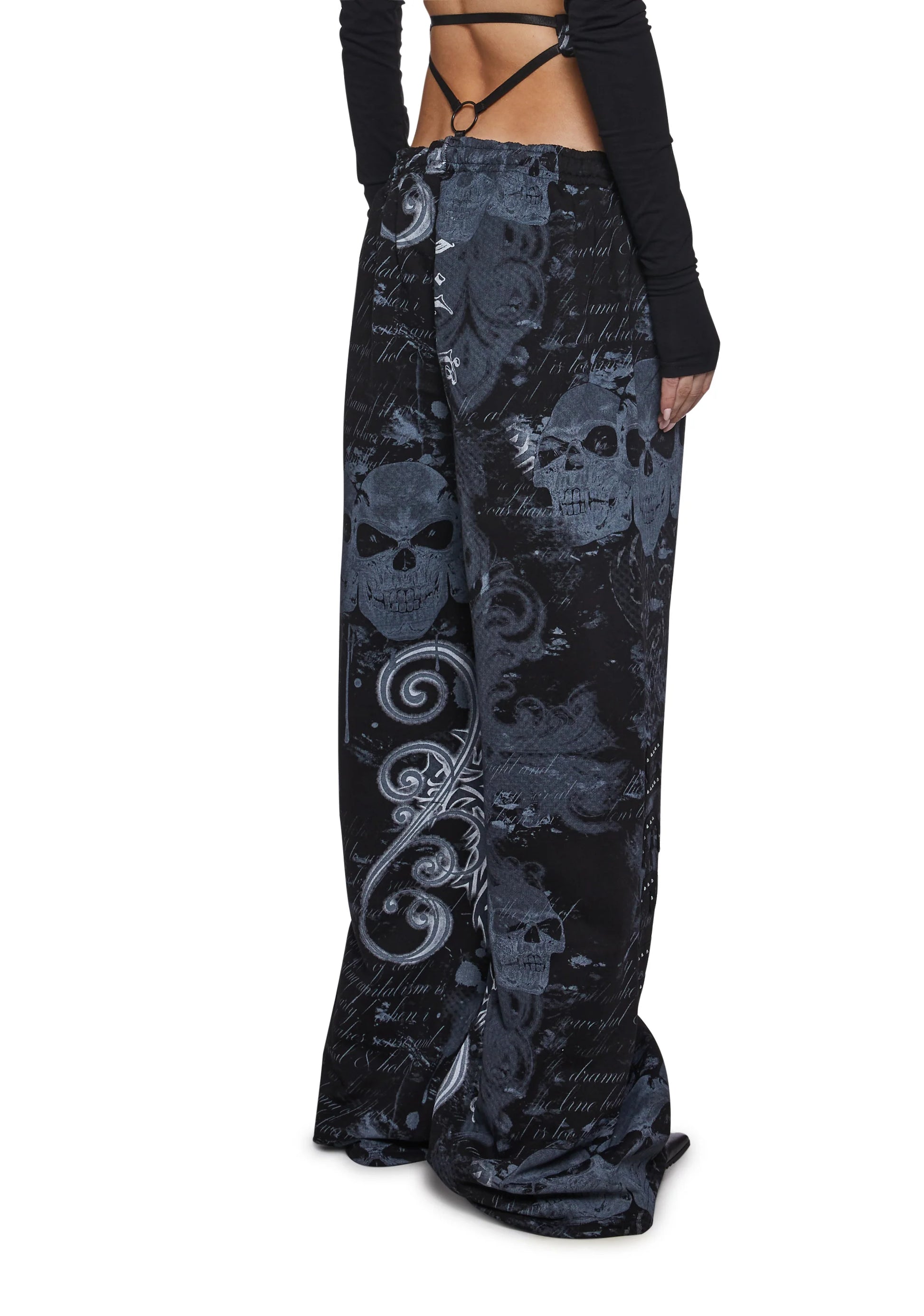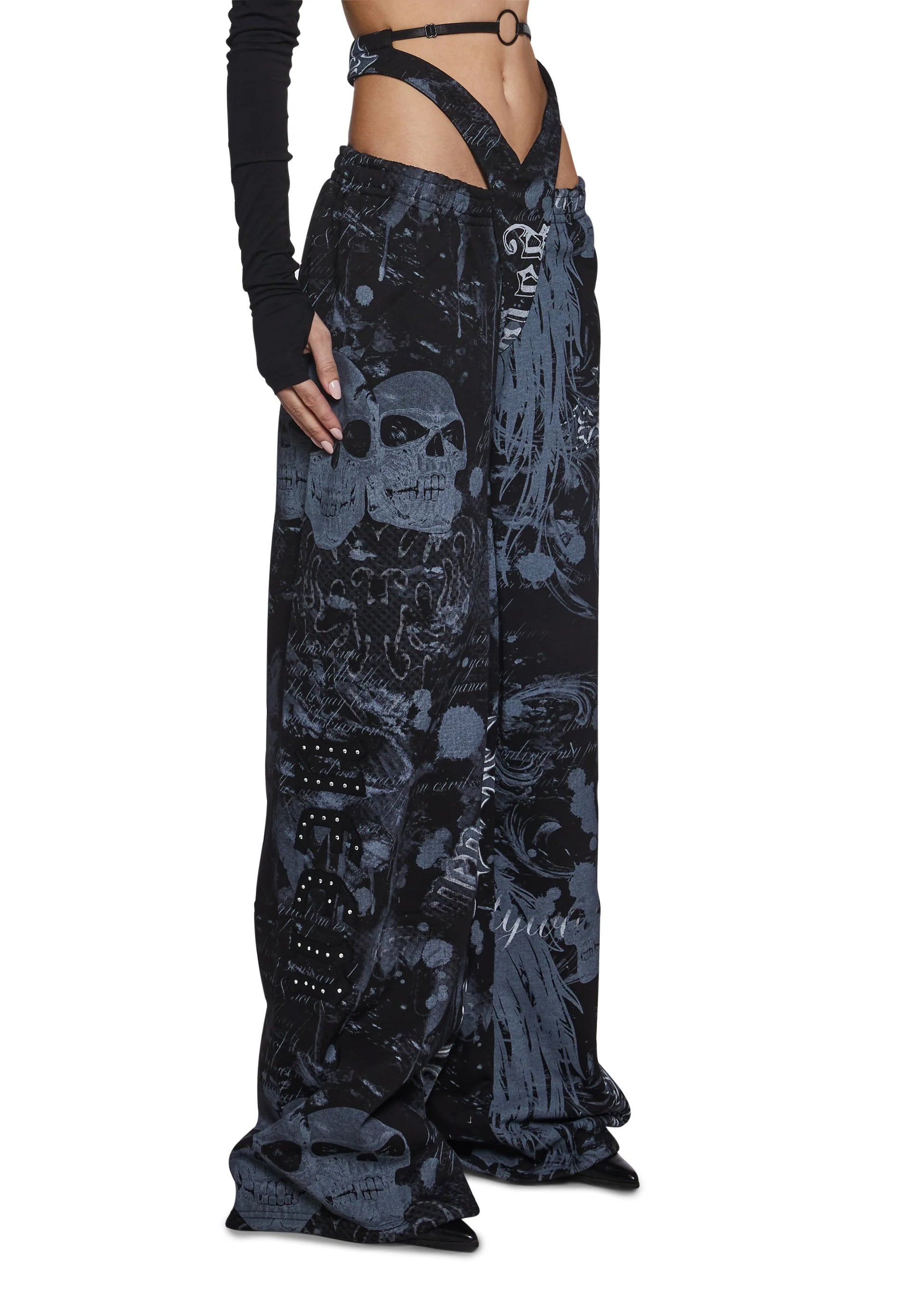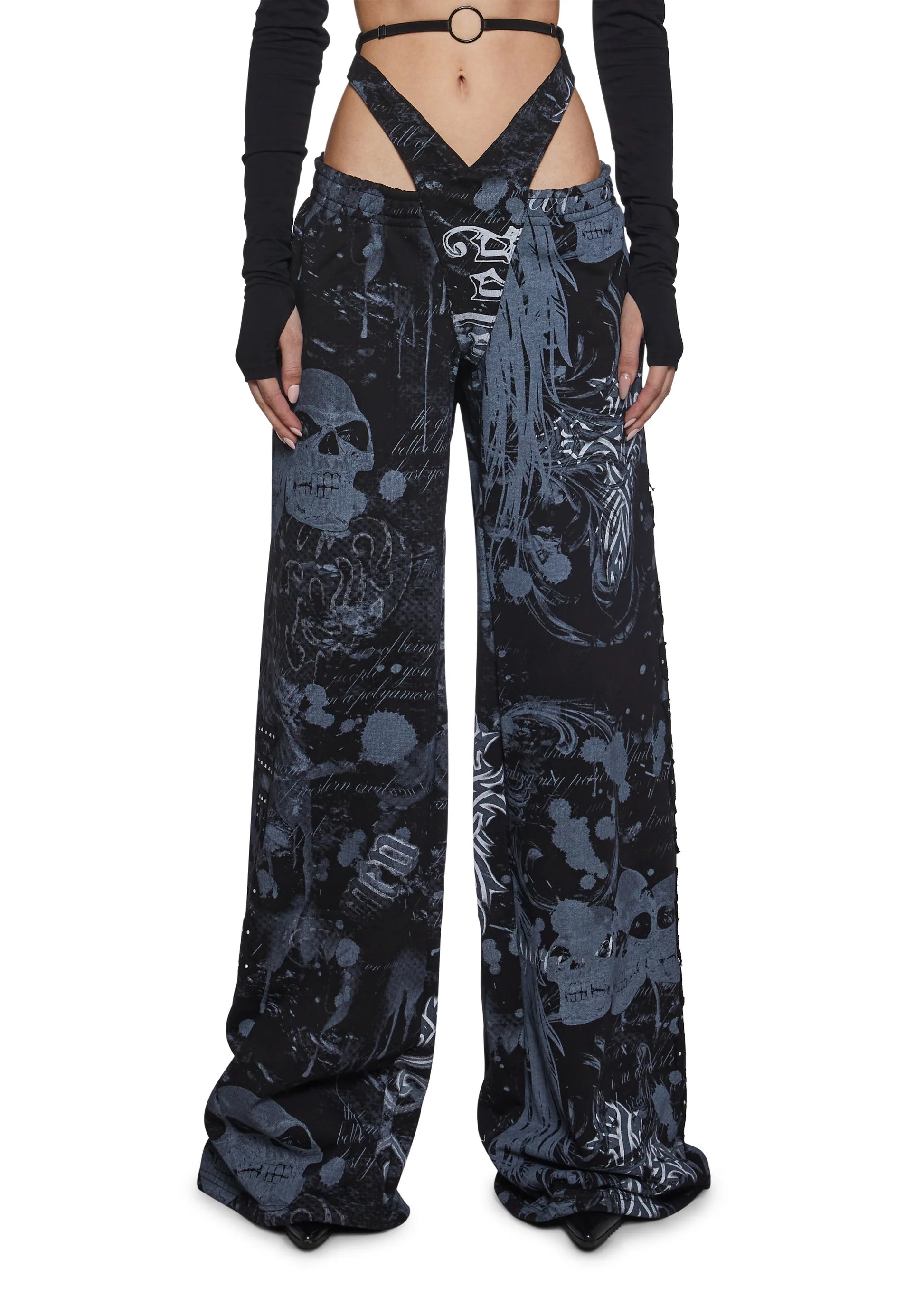 An edgy graphic sweatpants with daring g-string detail and wide-leg street-style energy perfect for festival outfits party looks or bold everyday fashion