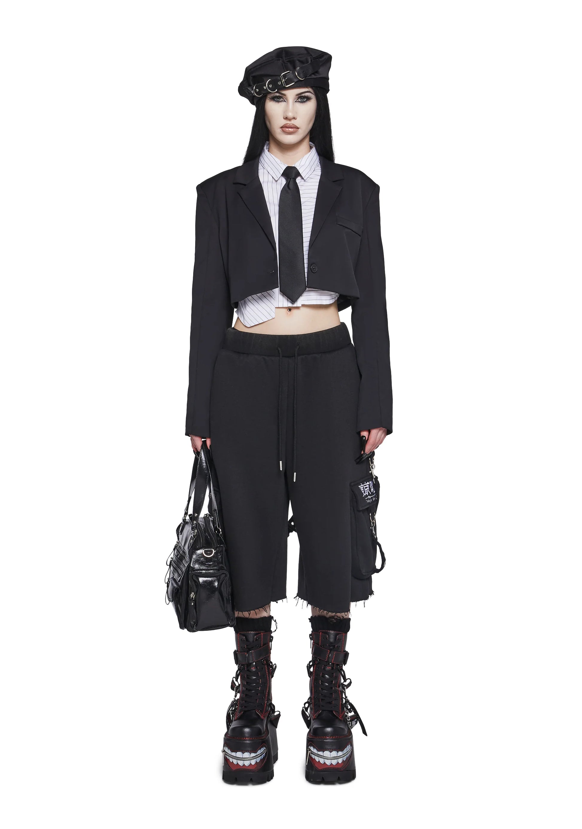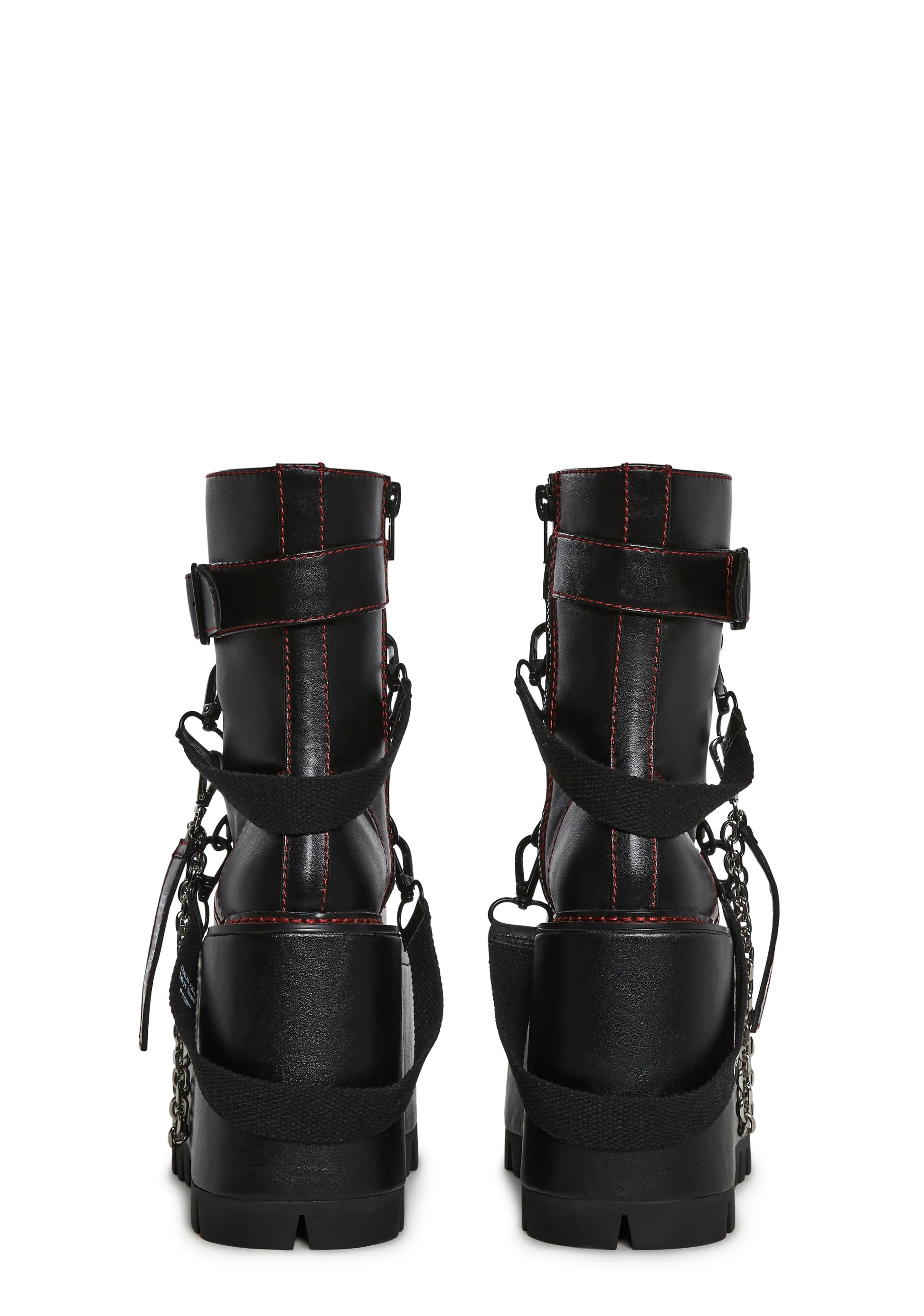 These boots have a vegan leather construction, contrast colored stitching, high wedge platform heels, wrap straps with adjustable buckles, D-ring hardware, front lace-ups, side zipper closures, removable straps, removable chainlinks, removable Tokyo Ghoul keychain, and Kakuja zippered mouth graphics on the front.