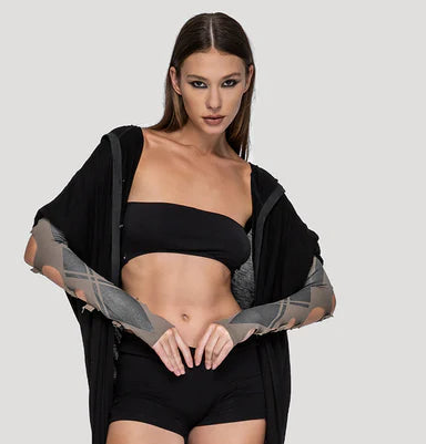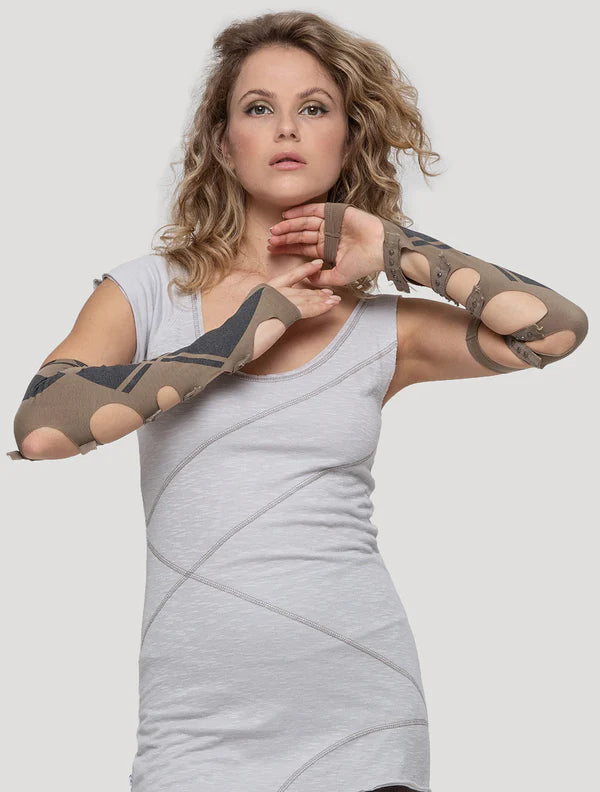 These long fingerless gloves are made with our lightweight, organic jersey, which is heavenly soft and super stretchy, like a second skin. The Geometric glitter finish screen print that shines in the light, decorative straps and custom-made metal studs around the rounded cut-outs on the inner arm all add character to this standout accessory.- Length: 40 cm
