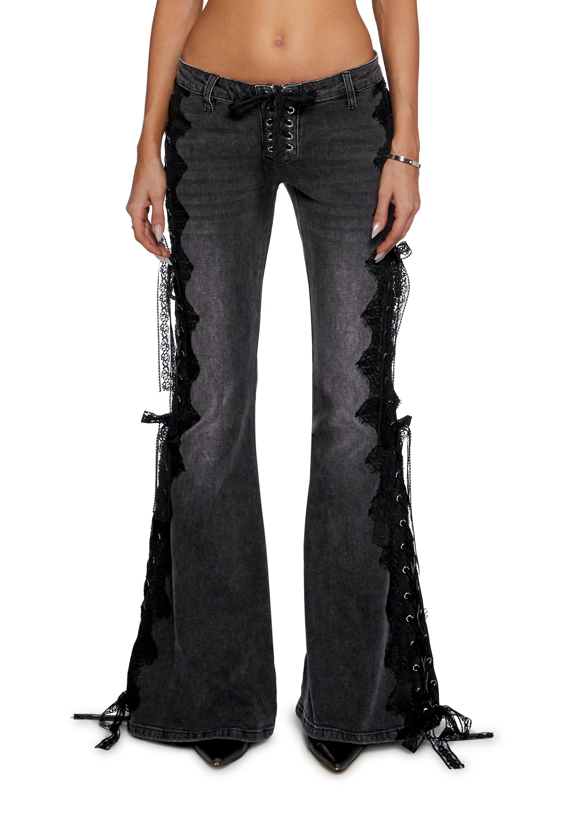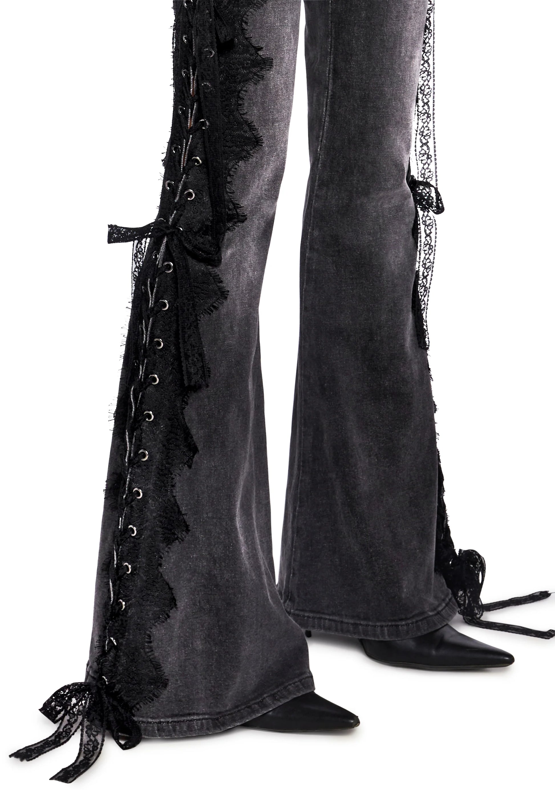 Washed denim flare jeans with lace-trim accents and a full lace-up side design featuring delicate bow ties and grommet hardware.