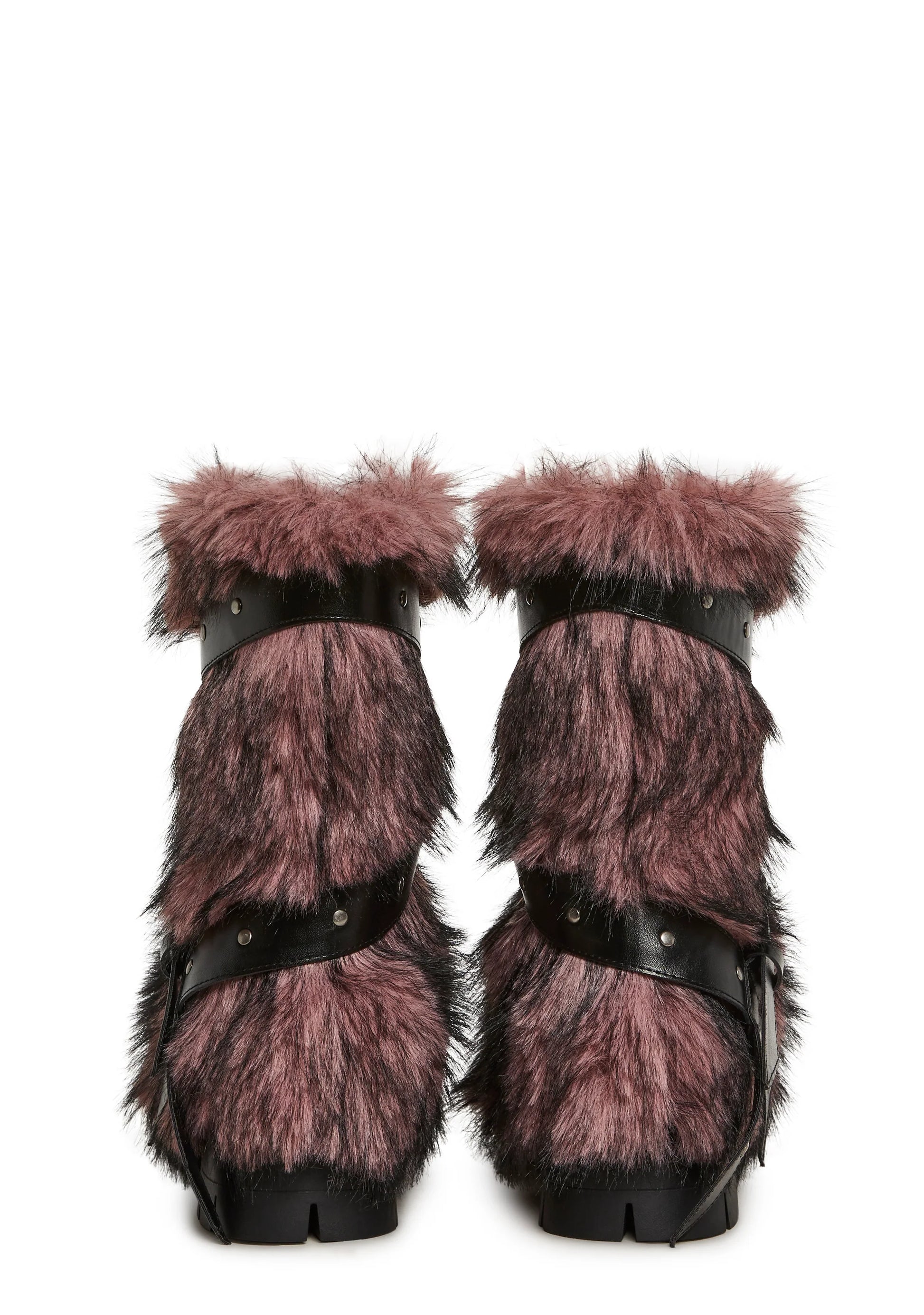 These platform boots have a faux fur construction, a pull-on fit, platform soles, and adjustable wrap buckle straps with O-ring hardware.