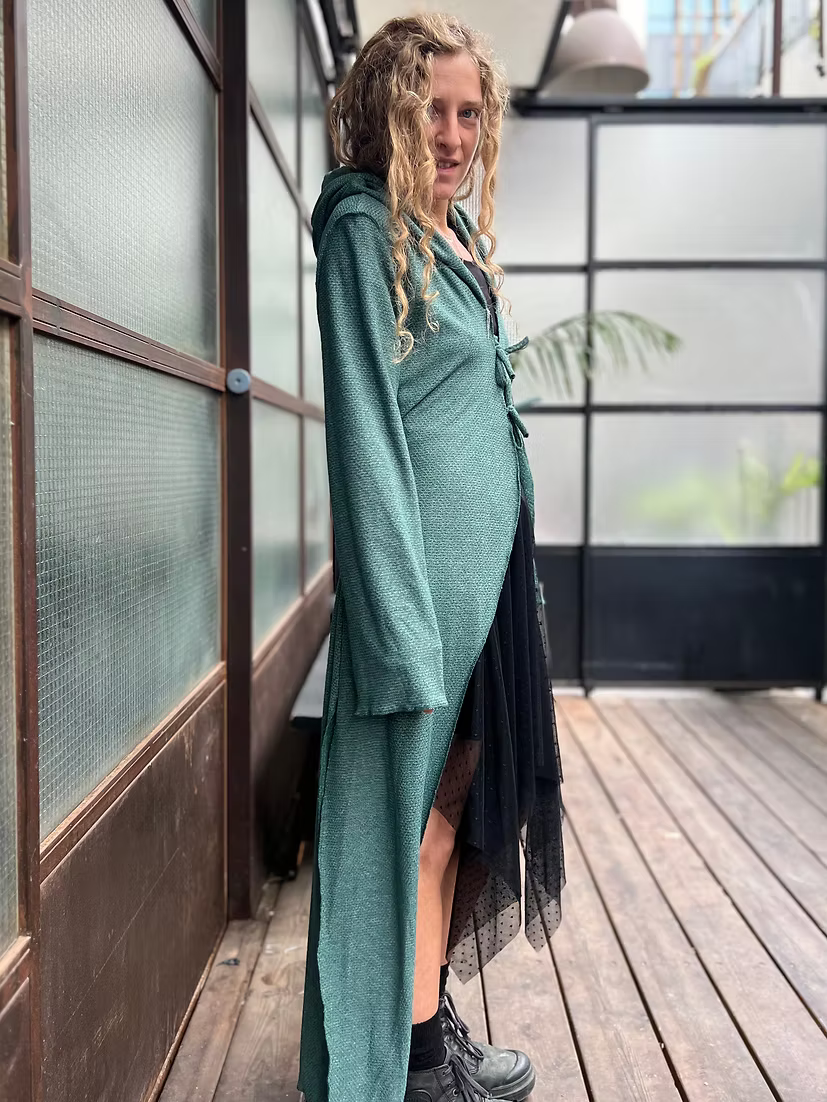 Made from lightweight soft knit fabric in a deep natural green, it drapes beautifully along the body, creating an elegant and free-spirited silhouette.