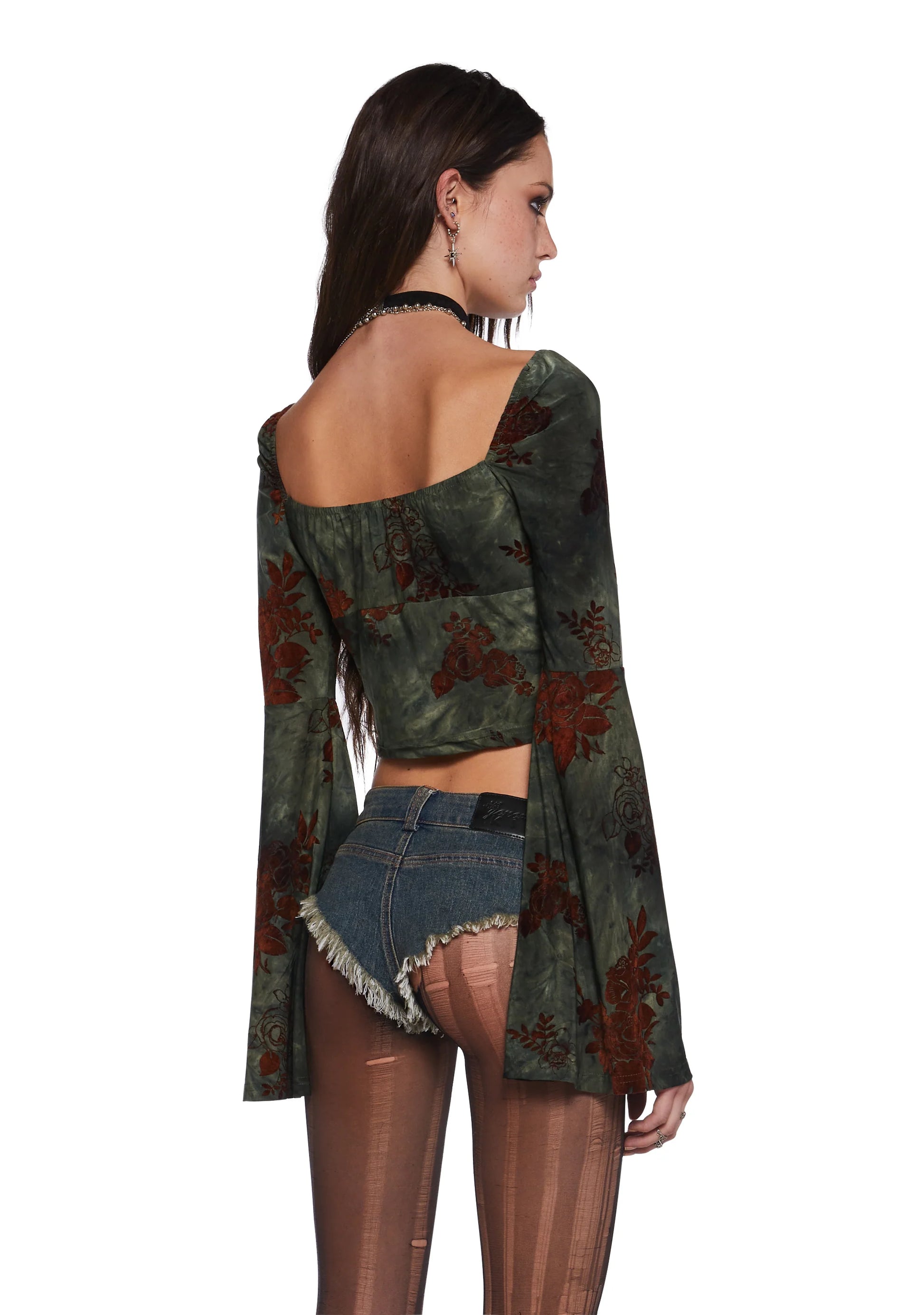 Features a wide neckline, ruched front with self-tie hem, and dramatic bell sleeves for fluid, witchy movement.
