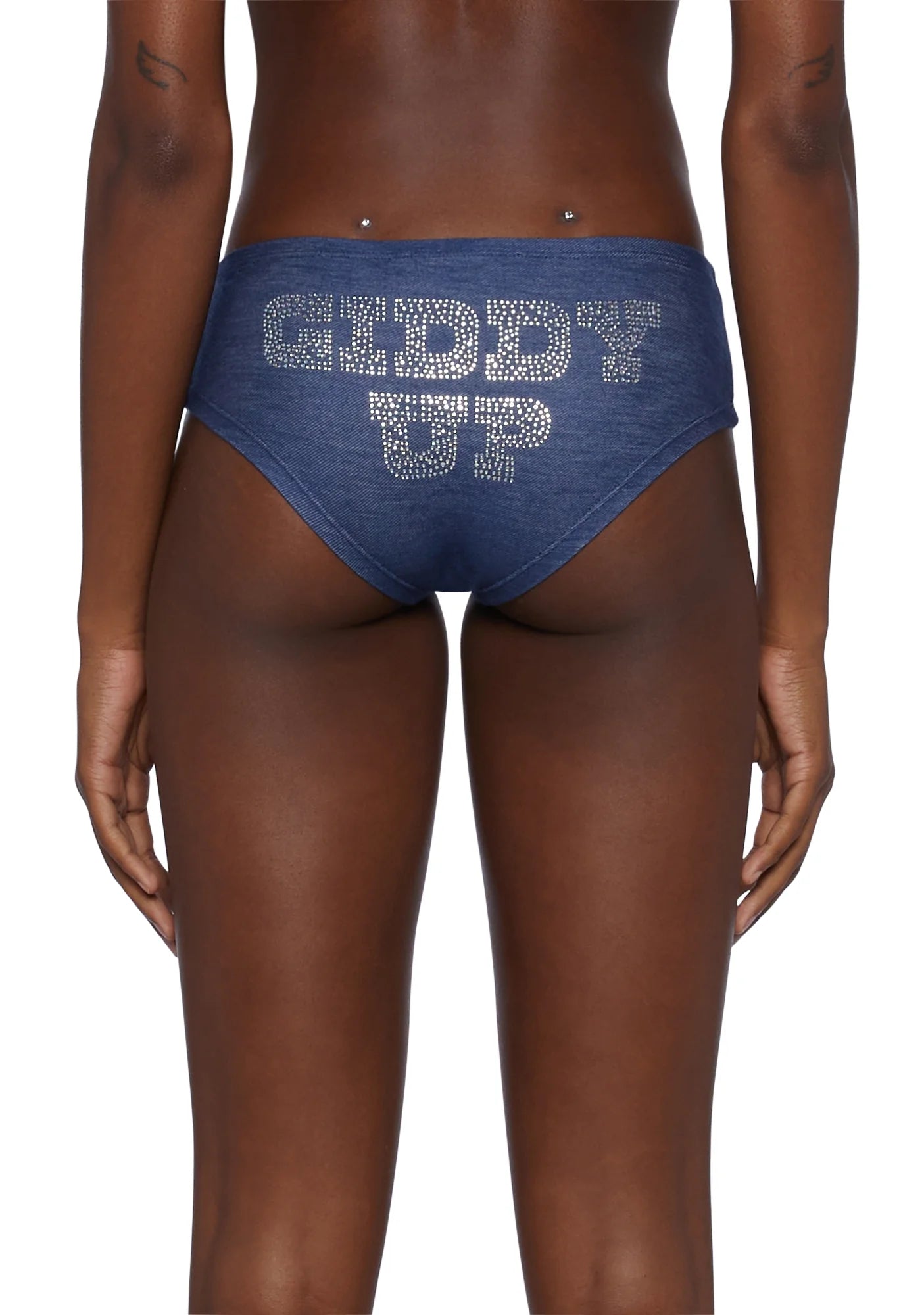 This multi piece rodeo set blends denim illusion with crystal glow — sculpted silhouettes, shimmering rhinestone energy, and bold lettering at the back that marks every step with presence and attitude.