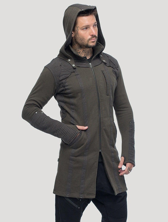Fitted 3⁄4 coat with a detachable hood, high turtleneck collar, and sleeve thumb inserts. The sleeves, hood and pocket tabs are decorated with pleated cotton. The shoulders are embellished with a scale-inspired patchwork of our up-cycled cotton scraps. An assassin style that is both cool and mysterious.