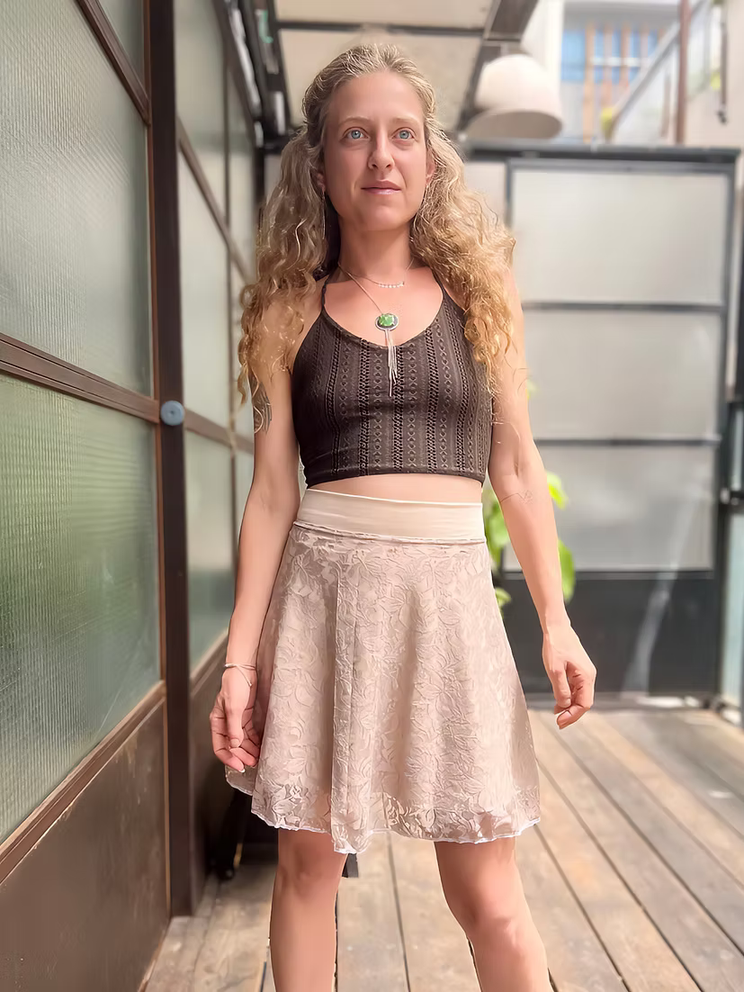 Its high waist and circle-cut silhouette create natural flow and flattering movement, hugging lightly without clinging.