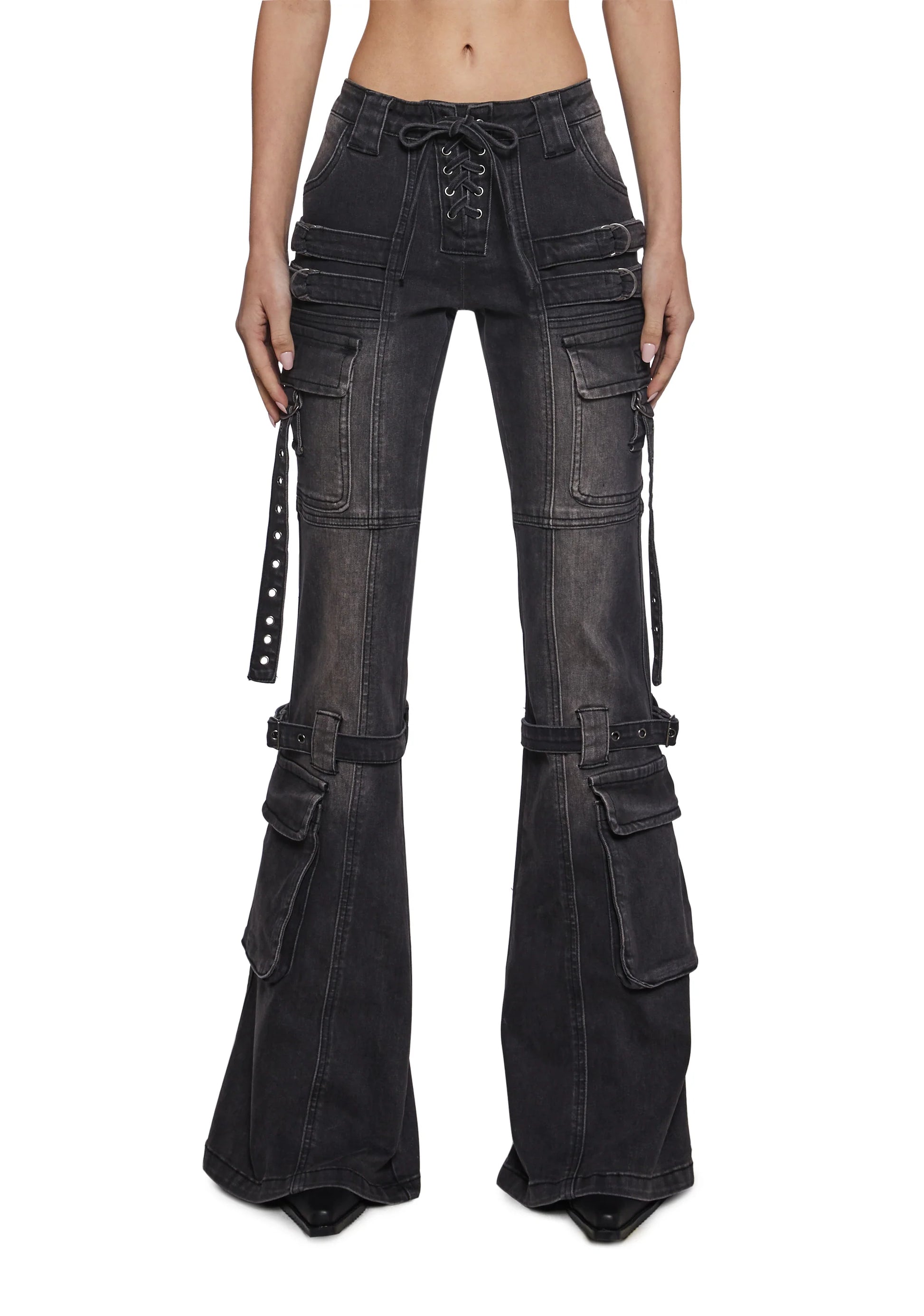 A raw, street-charged statement forged in structured denim power. These fitted cargo jeans sculpt the body while carrying a rebellious, utility-driven spirit. The lace-up front pulls focus to the waist, while the flared leg elongates the silhouette with confident presence. Loaded with pockets, straps, and metal hardware — this piece feels tactical, bold, and unapologetically dominant.