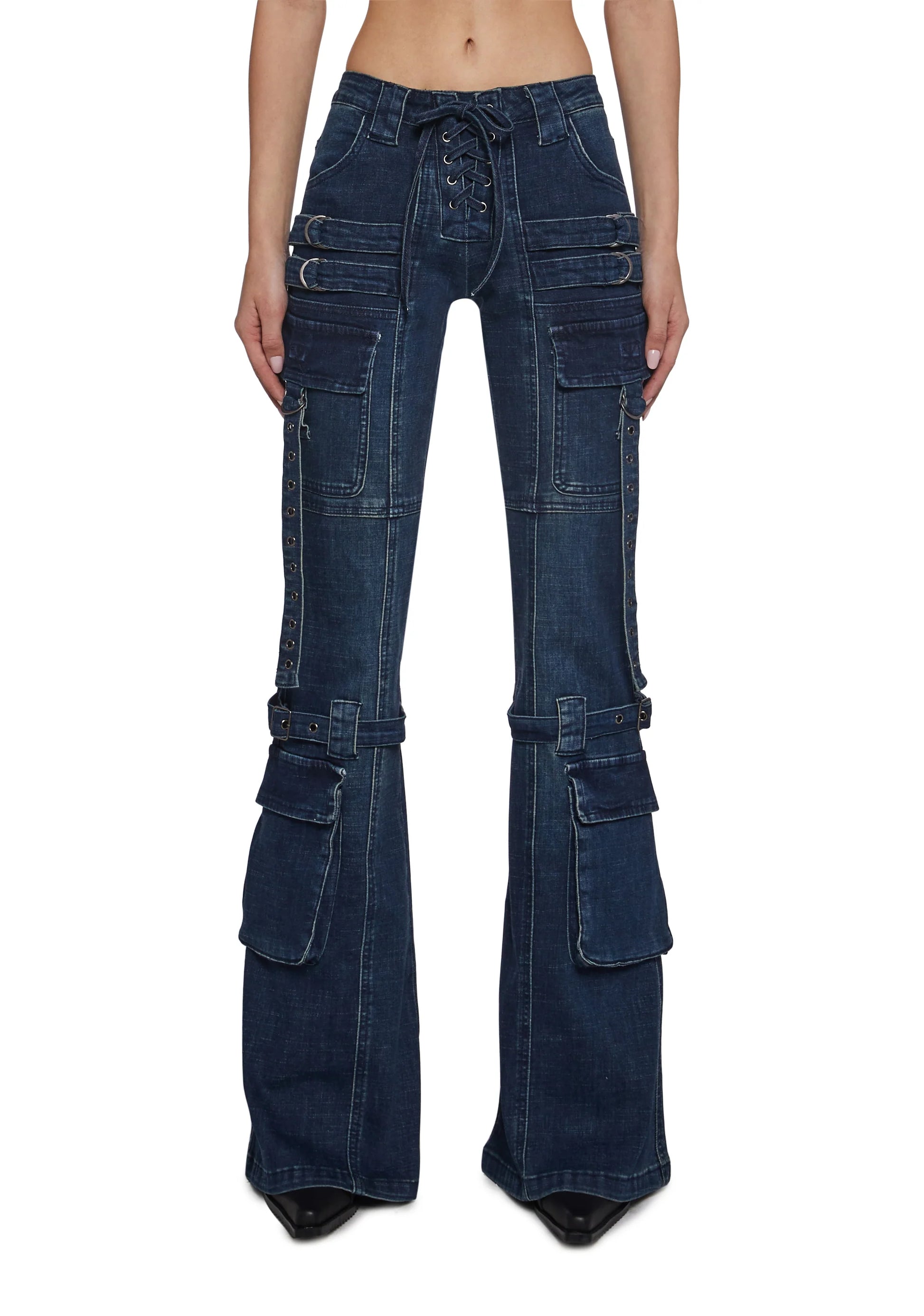 A raw, street-charged statement forged in structured denim power. These fitted cargo jeans sculpt the body while carrying a rebellious, utility-driven spirit. The lace-up front pulls focus to the waist, while the flared leg elongates the silhouette with confident presence. Loaded with pockets, straps, and metal hardware — this piece feels tactical, bold, and unapologetically dominant.