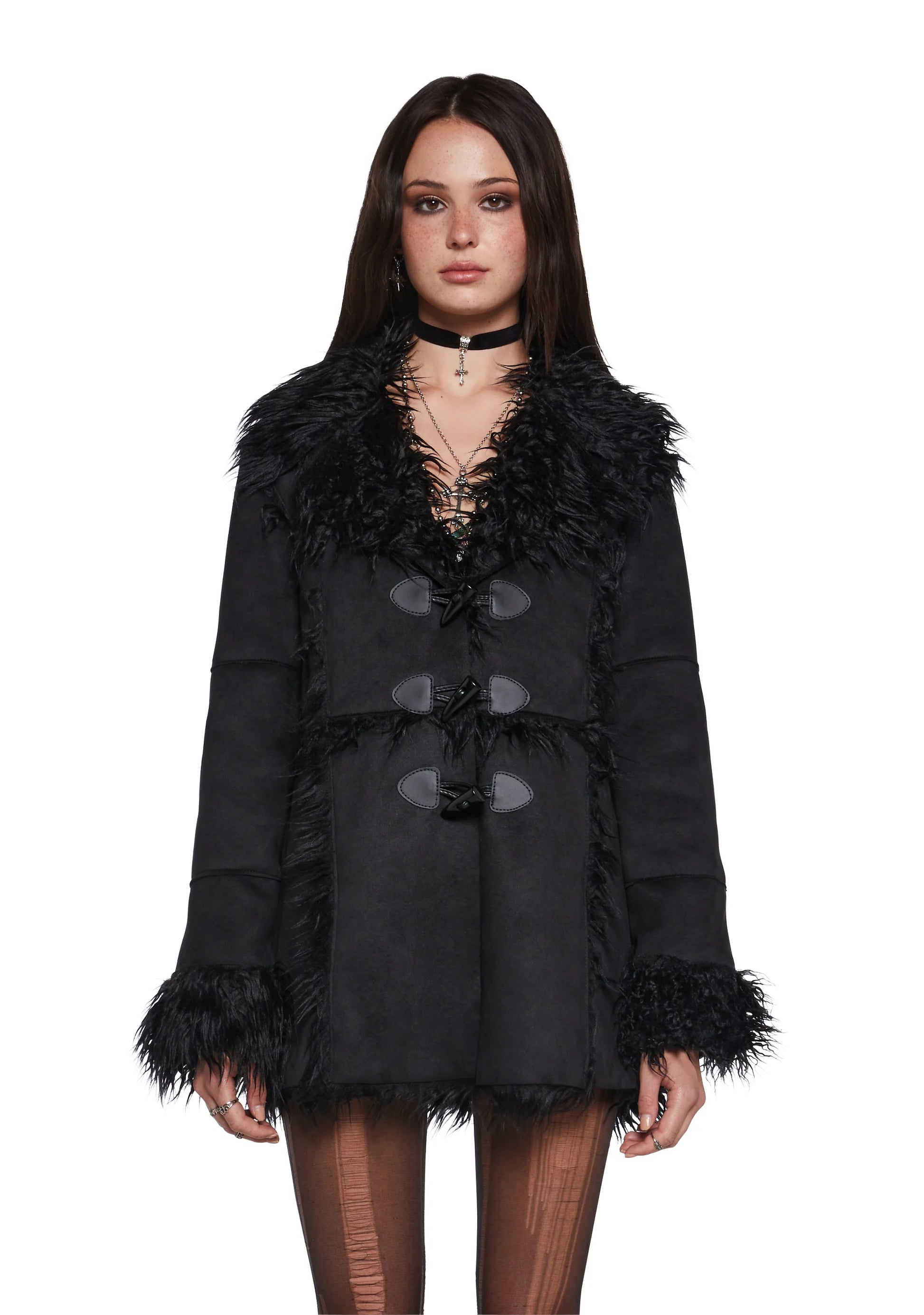 Suede Toggle Fur Coat — Black