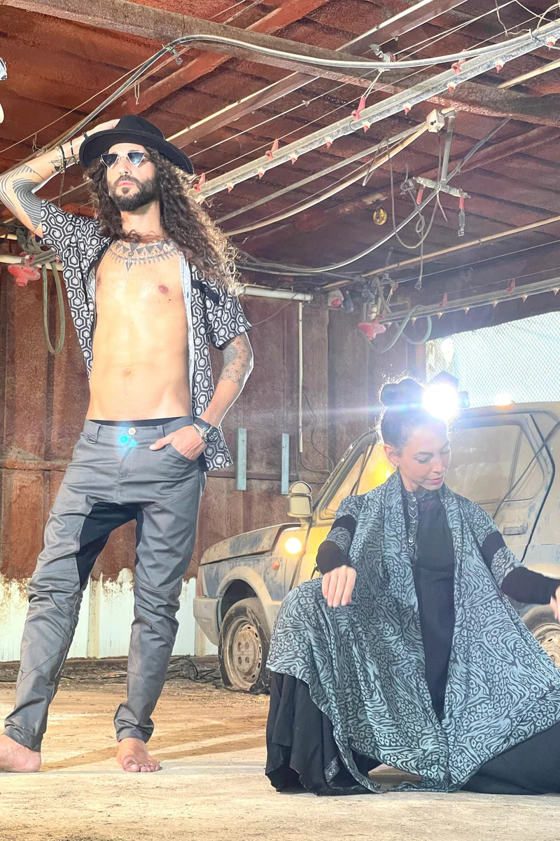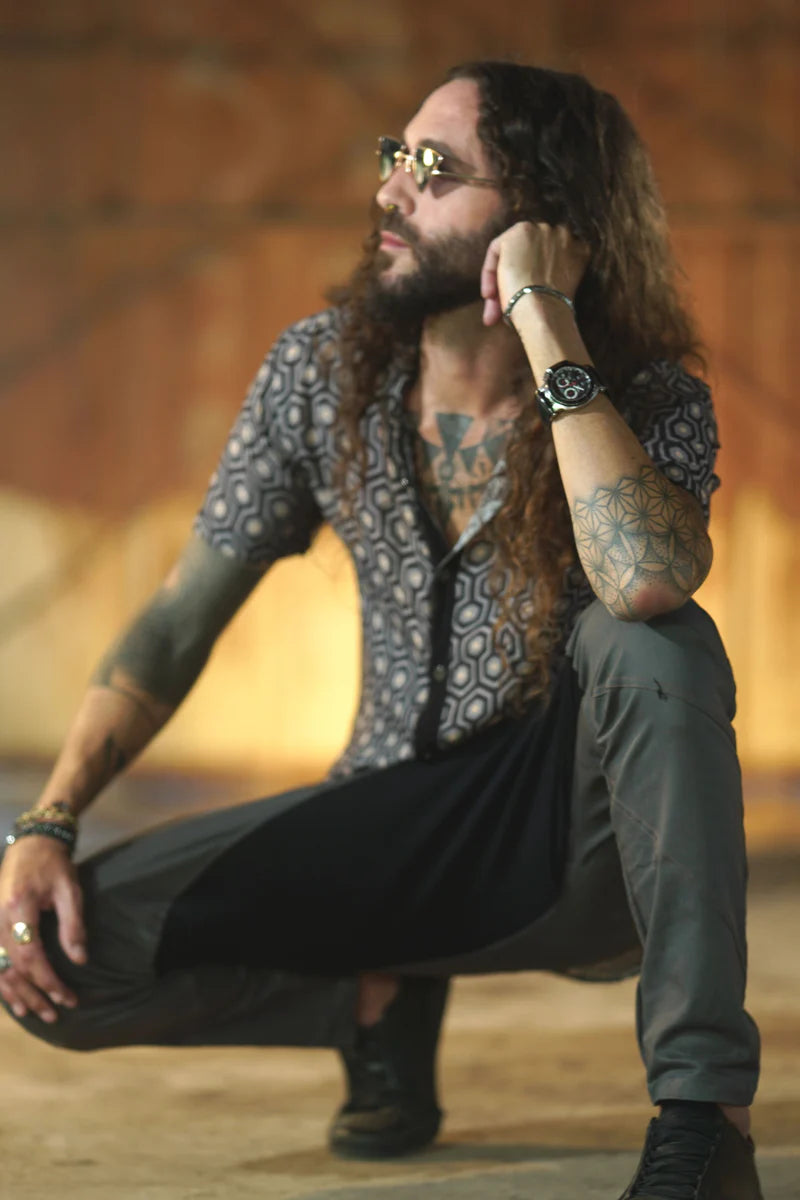 super cool, closed with silvery buttons, light drop crotch cut made of Lycra cotton fabric to assure comfort and flexibility, black decorated with a geometric print. The trousers are thin, lightweight, perfect for parties and festivals as well as for everyday wear.