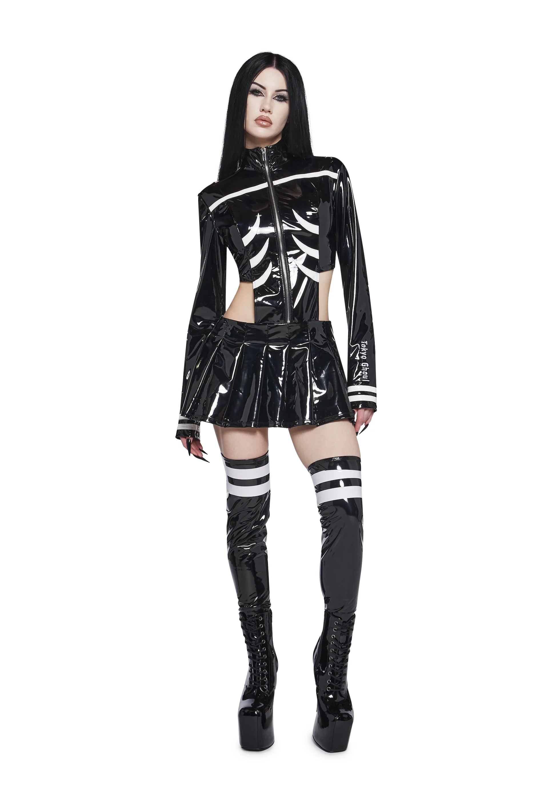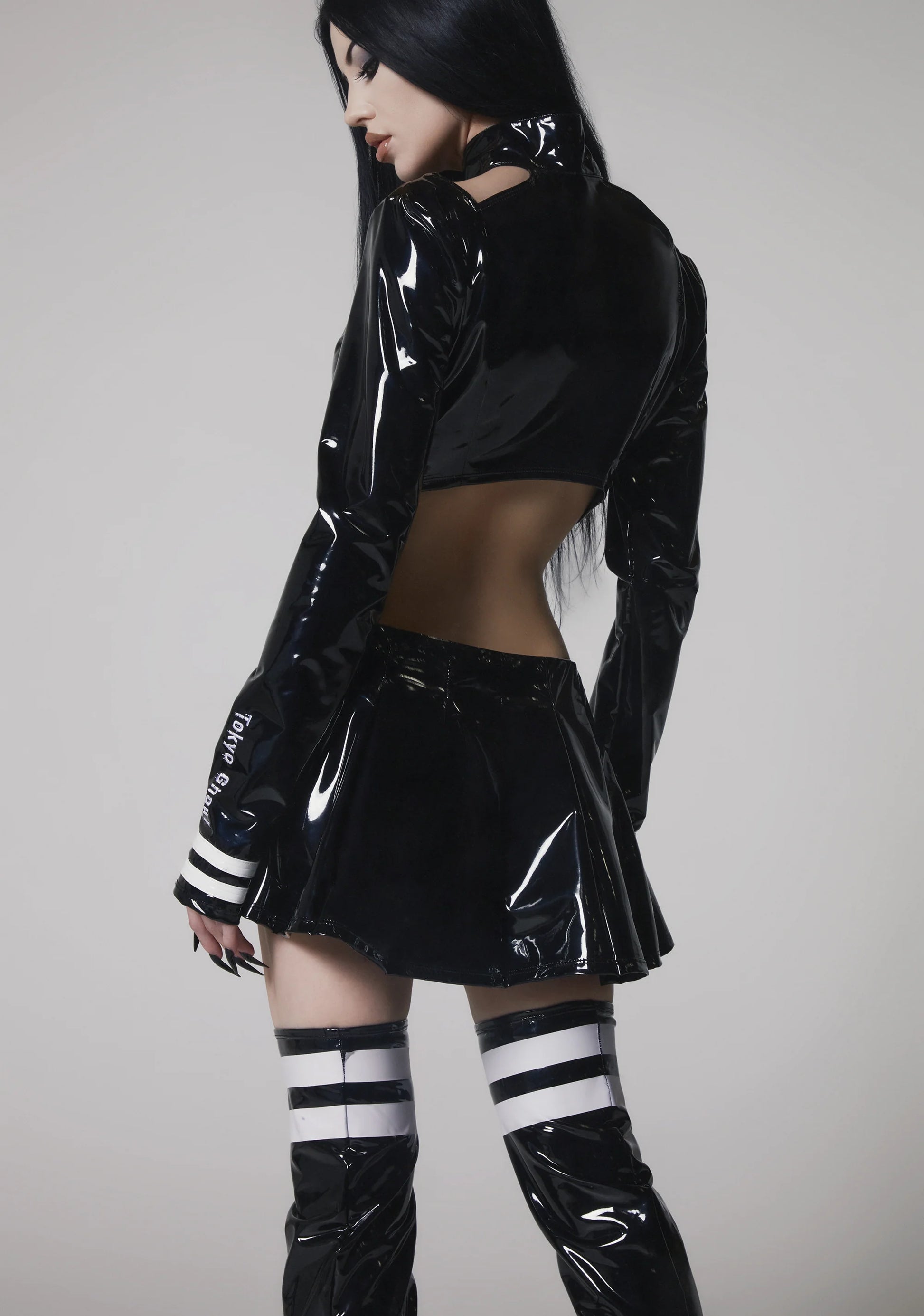 A dark, urban talisman infused with underground anime energy and rebellious edge. This vinyl mini dress sculpts the body in high-shine attitude while cut-outs and stripes sharpen the silhouette with graphic intensity. The pleated skirt adds movement and contrast to the structured top, while the embroidered logo detail seals the cult-core aesthetic. Finished with matching legwarmers, this set radiates bold, dystopian presence — built for night scenes, alt styling, and fearless self-expression.