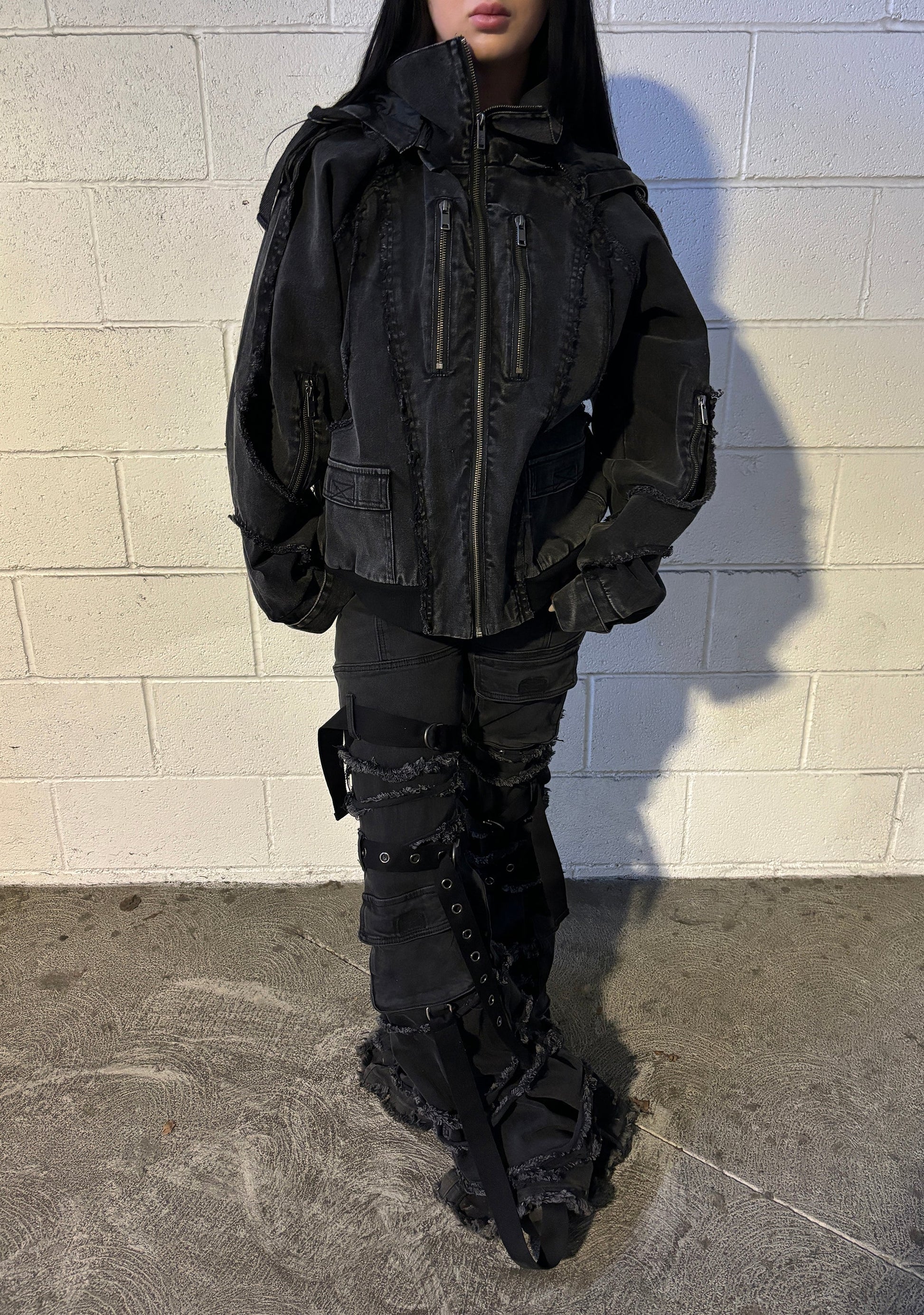 Features adjustable velcro cuffs, zip detailing, nylon strap accents, and a secure front zipper closure for a functional, tech-utility look.