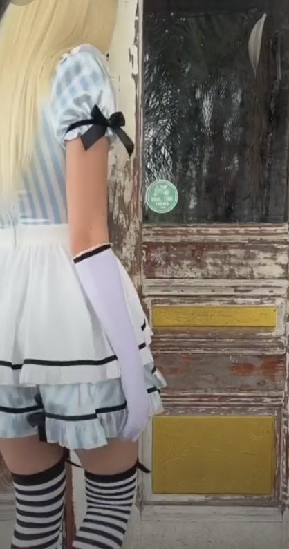 the look is layered with a classic white apron tied with a statement bow, while matching gloves, choker, socks, and a bow headband complete the transformation with gentle magic and nostalgic wonder.